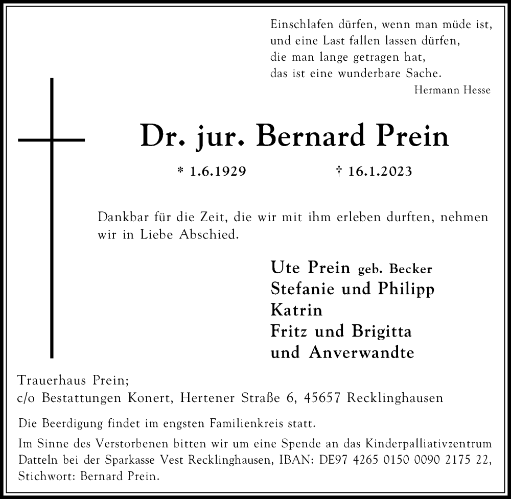 Hier finden Sie alle Traueranzeigen aus der Zeitung, die bisher für Bernard Prein erschienen sind. Weitere Traueranzeigen, die in der Zeitung erscheinen, werden hier ebenfalls aufgelistet