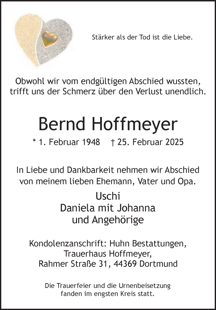 Hier finden Sie alle Traueranzeigen aus der Zeitung, die bisher für Bernd Hoffmeyer erschienen sind. Weitere Traueranzeigen, die in der Zeitung erscheinen, werden hier ebenfalls aufgelistet