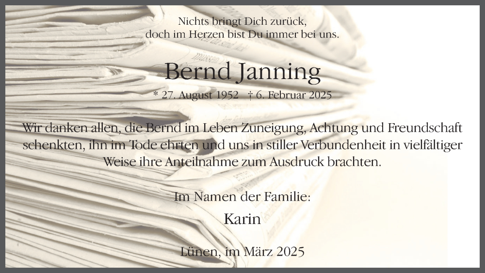 Hier finden Sie alle Traueranzeigen aus der Zeitung, die bisher für Bernd Janning erschienen sind. Weitere Traueranzeigen, die in der Zeitung erscheinen, werden hier ebenfalls aufgelistet