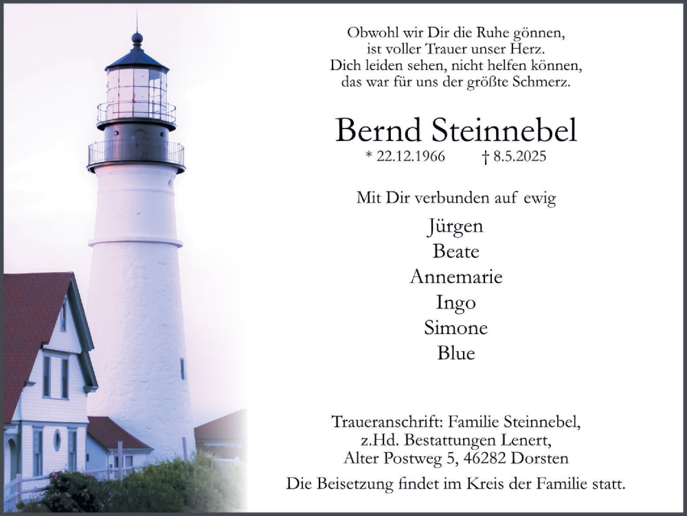 Hier finden Sie alle Traueranzeigen aus der Zeitung, die bisher für Bernd Steinnebel erschienen sind. Weitere Traueranzeigen, die in der Zeitung erscheinen, werden hier ebenfalls aufgelistet