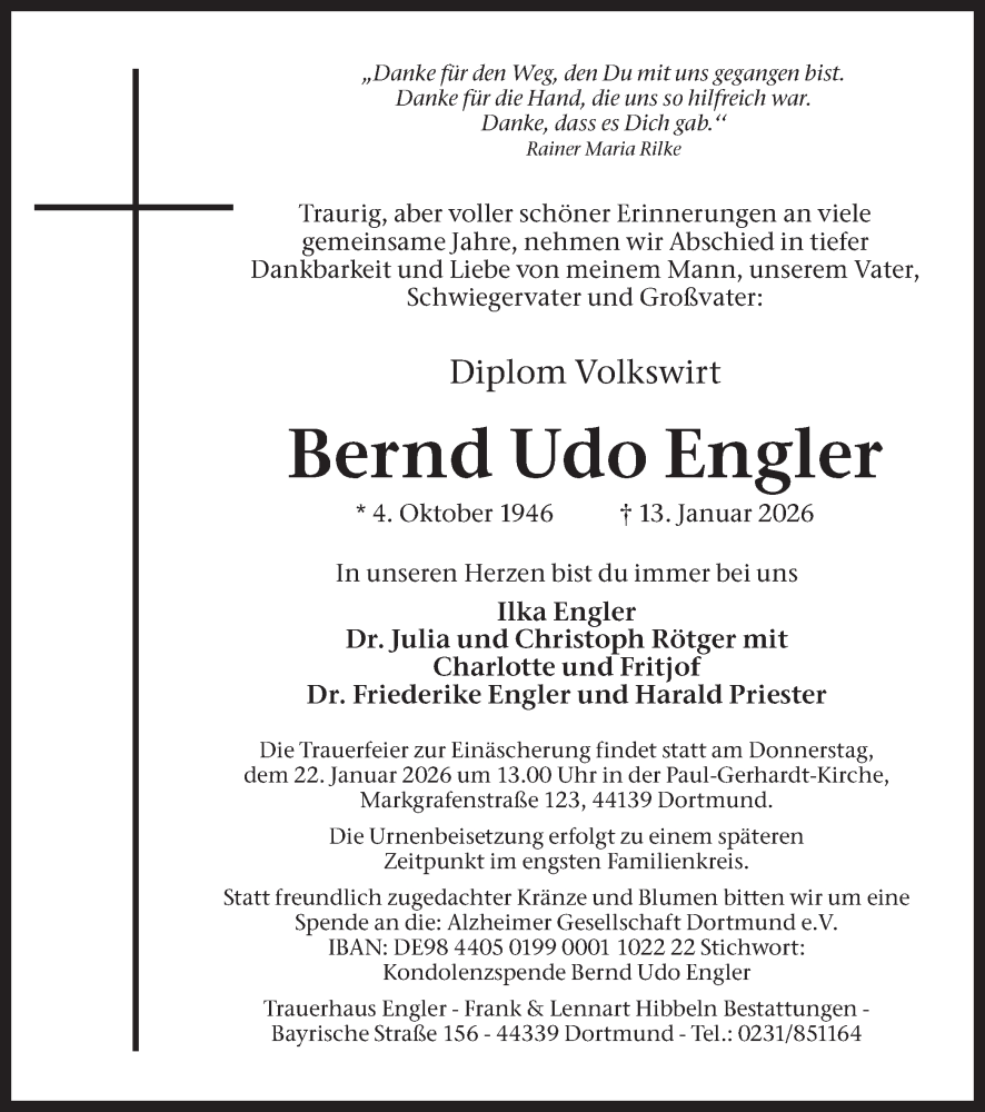 Hier finden Sie alle Traueranzeigen aus der Zeitung, die bisher für Bernd Udo Engler erschienen sind. Weitere Traueranzeigen, die in der Zeitung erscheinen, werden hier ebenfalls aufgelistet