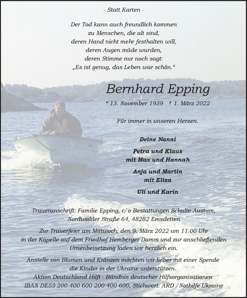 Hier finden Sie alle Traueranzeigen aus der Zeitung, die bisher für Bernhard Epping erschienen sind. Weitere Traueranzeigen, die in der Zeitung erscheinen, werden hier ebenfalls aufgelistet