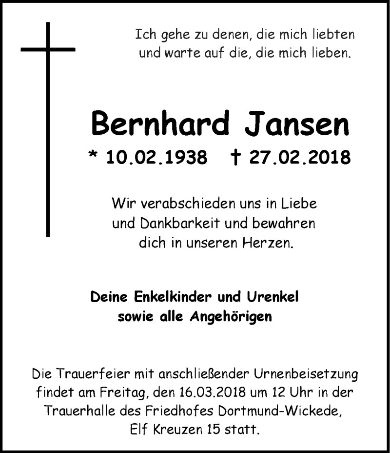 Hier finden Sie alle Traueranzeigen aus der Zeitung, die bisher für Bernhard Jansen erschienen sind. Weitere Traueranzeigen, die in der Zeitung erscheinen, werden hier ebenfalls aufgelistet