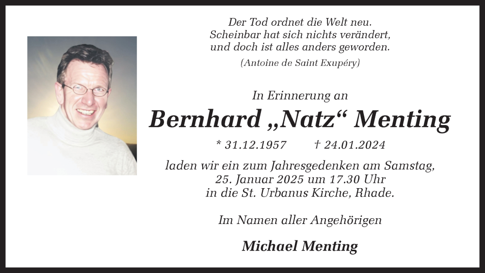 Hier finden Sie alle Traueranzeigen aus der Zeitung, die bisher für Bernhard Menting erschienen sind. Weitere Traueranzeigen, die in der Zeitung erscheinen, werden hier ebenfalls aufgelistet