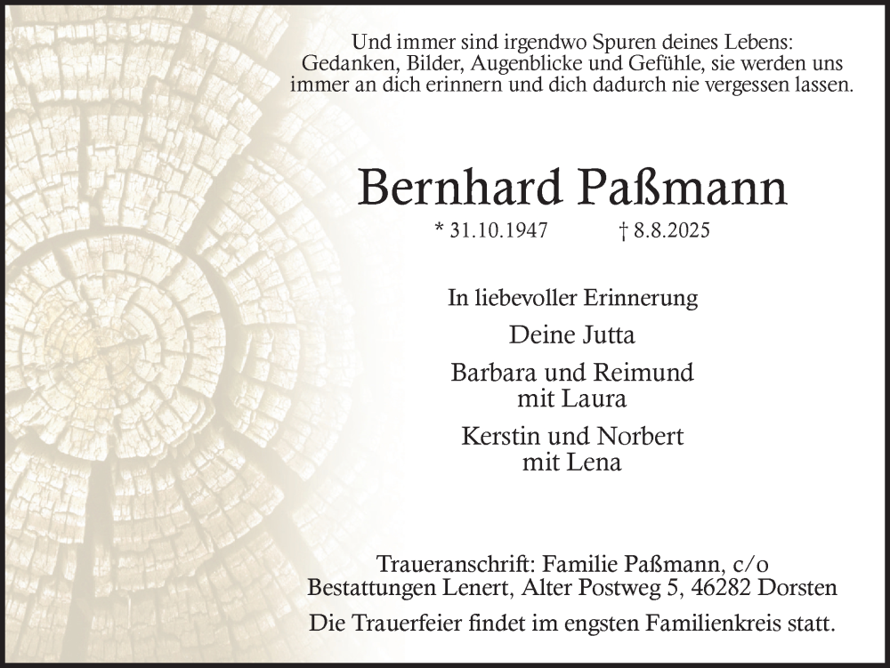 Hier finden Sie alle Traueranzeigen aus der Zeitung, die bisher für Bernhard Paßmann erschienen sind. Weitere Traueranzeigen, die in der Zeitung erscheinen, werden hier ebenfalls aufgelistet