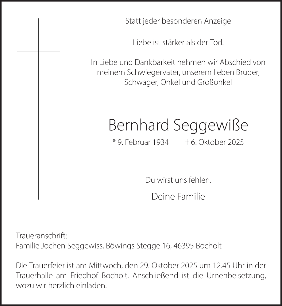 Hier finden Sie alle Traueranzeigen aus der Zeitung, die bisher für Bernhard Seggewiße erschienen sind. Weitere Traueranzeigen, die in der Zeitung erscheinen, werden hier ebenfalls aufgelistet