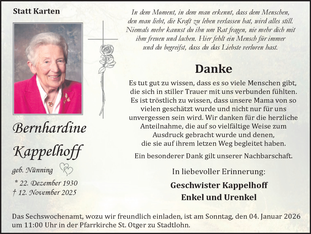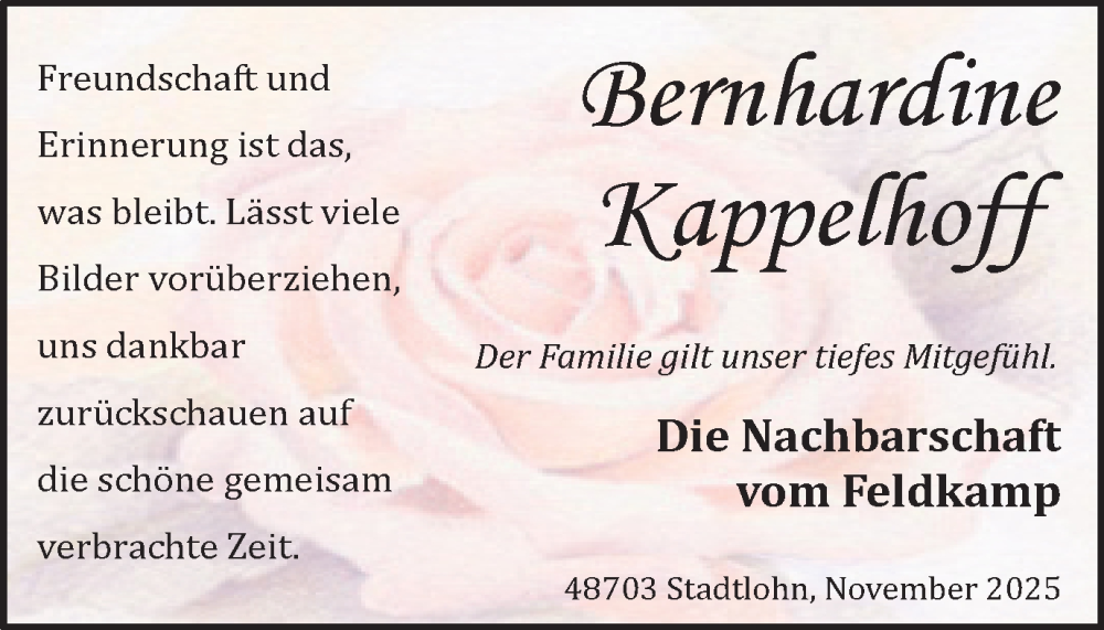 Hier finden Sie alle Traueranzeigen aus der Zeitung, die bisher für Bernhardine Kappelhoff erschienen sind. Weitere Traueranzeigen, die in der Zeitung erscheinen, werden hier ebenfalls aufgelistet
