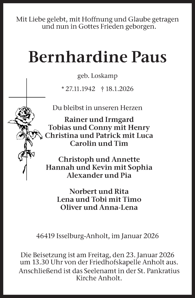 Hier finden Sie alle Traueranzeigen aus der Zeitung, die bisher für Bernhardine Paus erschienen sind. Weitere Traueranzeigen, die in der Zeitung erscheinen, werden hier ebenfalls aufgelistet