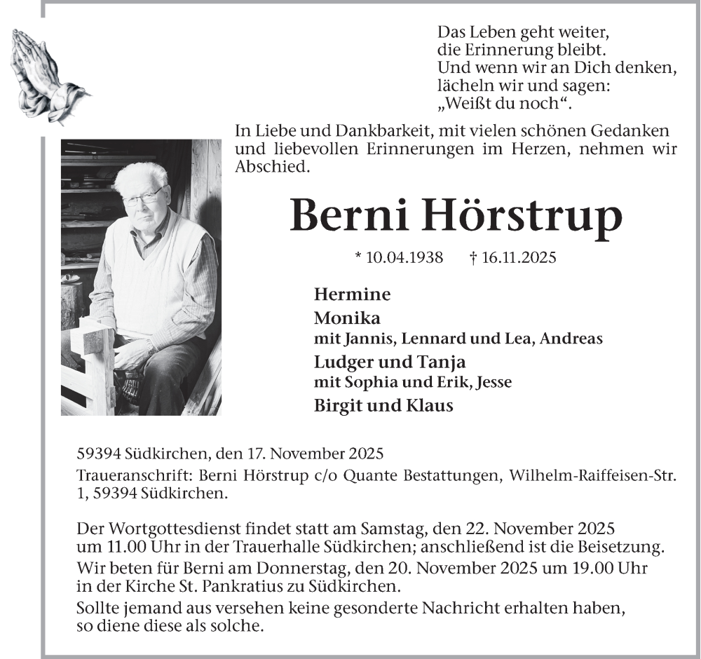 Hier finden Sie alle Traueranzeigen aus der Zeitung, die bisher für Berni Hörstrup erschienen sind. Weitere Traueranzeigen, die in der Zeitung erscheinen, werden hier ebenfalls aufgelistet