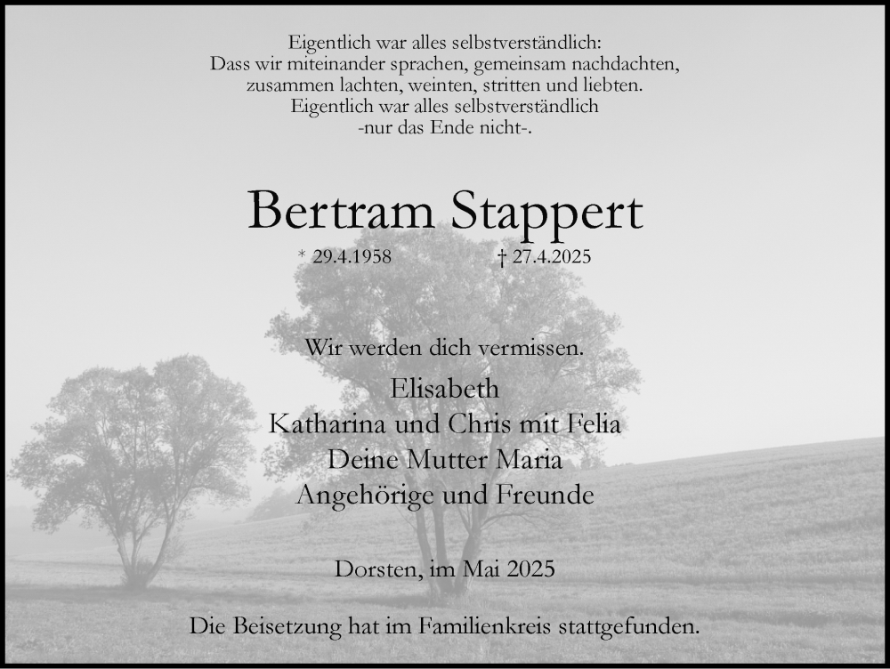 Hier finden Sie alle Traueranzeigen aus der Zeitung, die bisher für Bertram Stappert erschienen sind. Weitere Traueranzeigen, die in der Zeitung erscheinen, werden hier ebenfalls aufgelistet