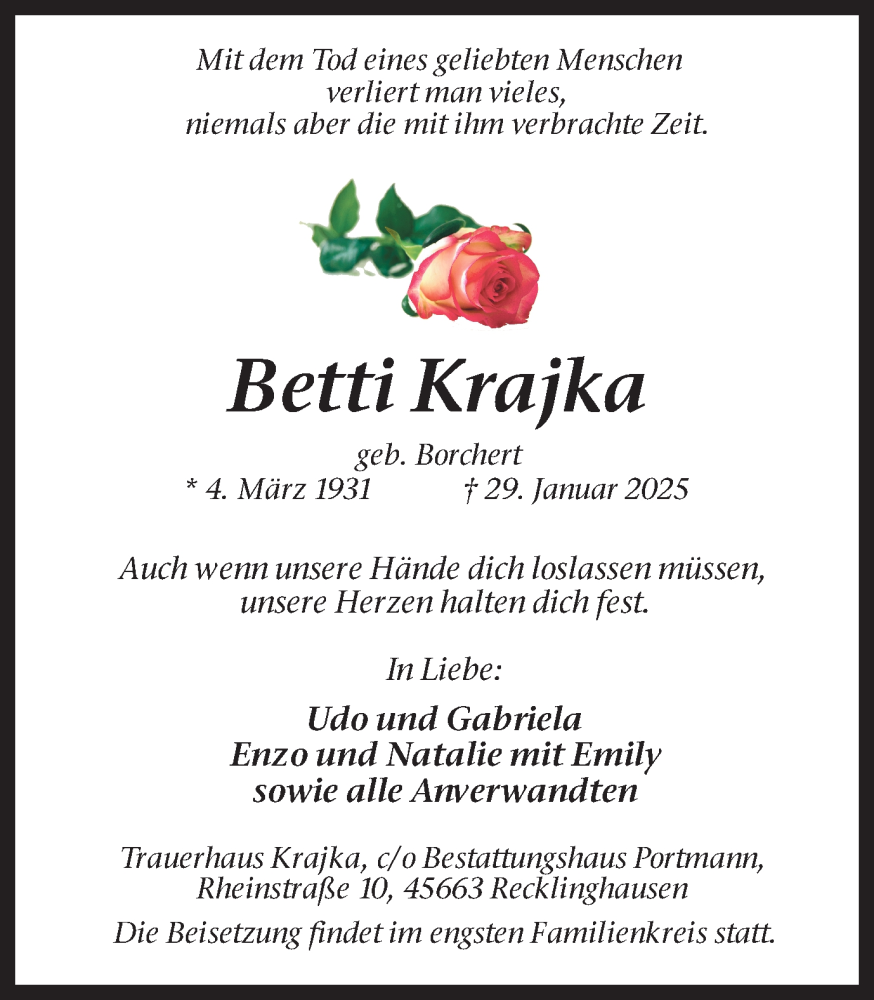 Hier finden Sie alle Traueranzeigen aus der Zeitung, die bisher für Betti Krajka erschienen sind. Weitere Traueranzeigen, die in der Zeitung erscheinen, werden hier ebenfalls aufgelistet
