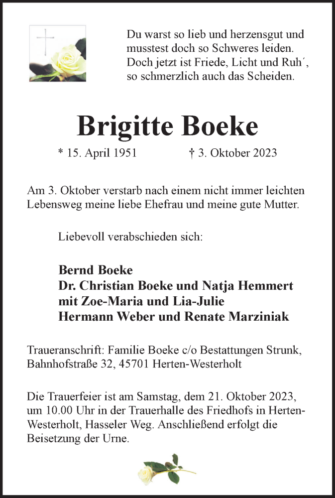 Hier finden Sie alle Traueranzeigen aus der Zeitung, die bisher für Brigitte Boeke erschienen sind. Weitere Traueranzeigen, die in der Zeitung erscheinen, werden hier ebenfalls aufgelistet