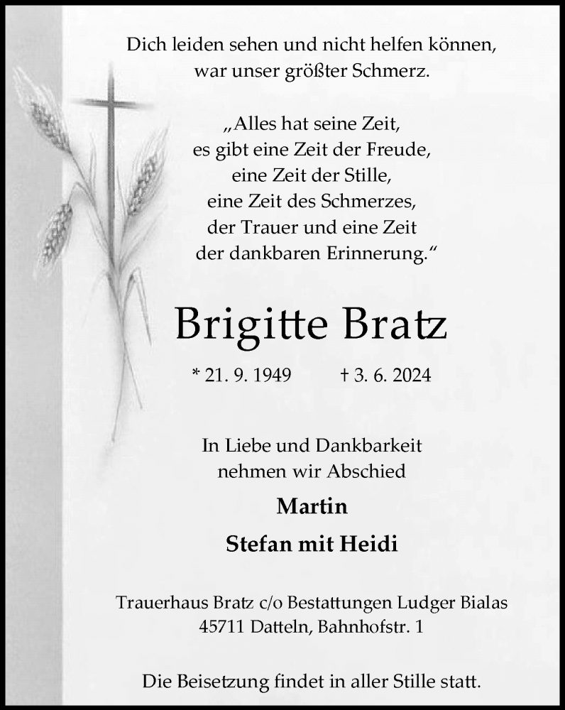 Hier finden Sie alle Traueranzeigen aus der Zeitung, die bisher für Brigitte Bratz erschienen sind. Weitere Traueranzeigen, die in der Zeitung erscheinen, werden hier ebenfalls aufgelistet