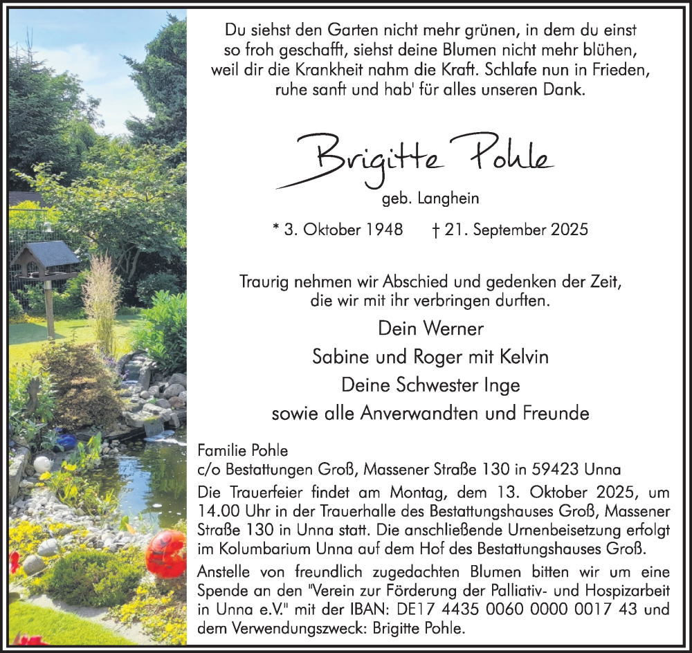 Hier finden Sie alle Traueranzeigen aus der Zeitung, die bisher für Brigitte Pohle erschienen sind. Weitere Traueranzeigen, die in der Zeitung erscheinen, werden hier ebenfalls aufgelistet