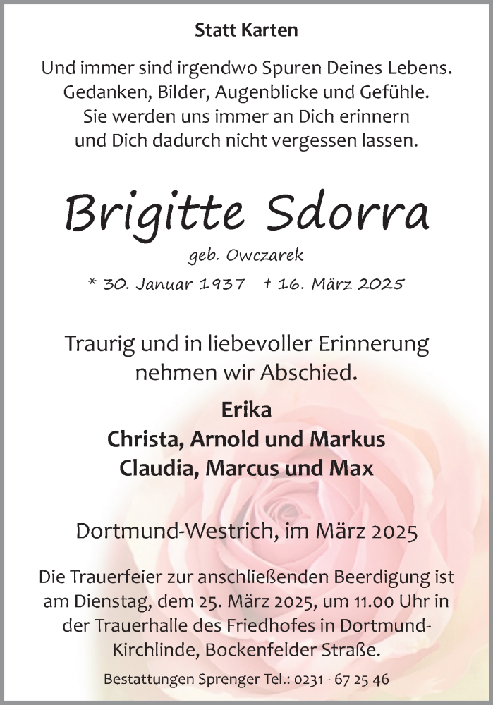Hier finden Sie alle Traueranzeigen aus der Zeitung, die bisher für Brigitte Sdorra erschienen sind. Weitere Traueranzeigen, die in der Zeitung erscheinen, werden hier ebenfalls aufgelistet