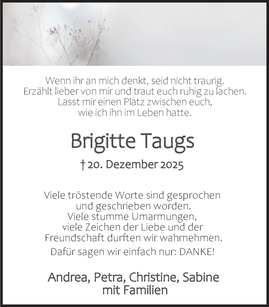 Hier finden Sie alle Traueranzeigen aus der Zeitung, die bisher für Brigitte Taugs erschienen sind. Weitere Traueranzeigen, die in der Zeitung erscheinen, werden hier ebenfalls aufgelistet