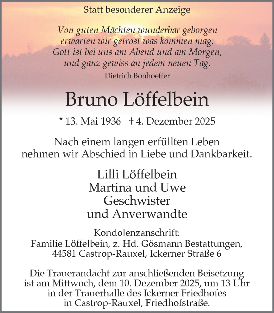 Hier finden Sie alle Traueranzeigen aus der Zeitung, die bisher für Bruno Löffelbein erschienen sind. Weitere Traueranzeigen, die in der Zeitung erscheinen, werden hier ebenfalls aufgelistet