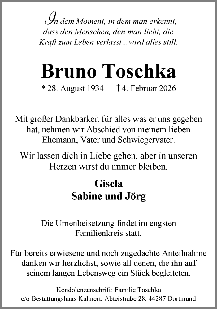 Hier finden Sie alle Traueranzeigen aus der Zeitung, die bisher für Bruno Toschka erschienen sind. Weitere Traueranzeigen, die in der Zeitung erscheinen, werden hier ebenfalls aufgelistet