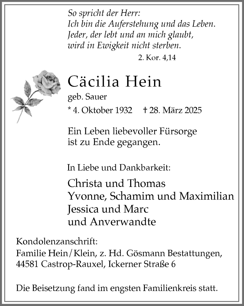 Hier finden Sie alle Traueranzeigen aus der Zeitung, die bisher für Cäcilia Hein erschienen sind. Weitere Traueranzeigen, die in der Zeitung erscheinen, werden hier ebenfalls aufgelistet