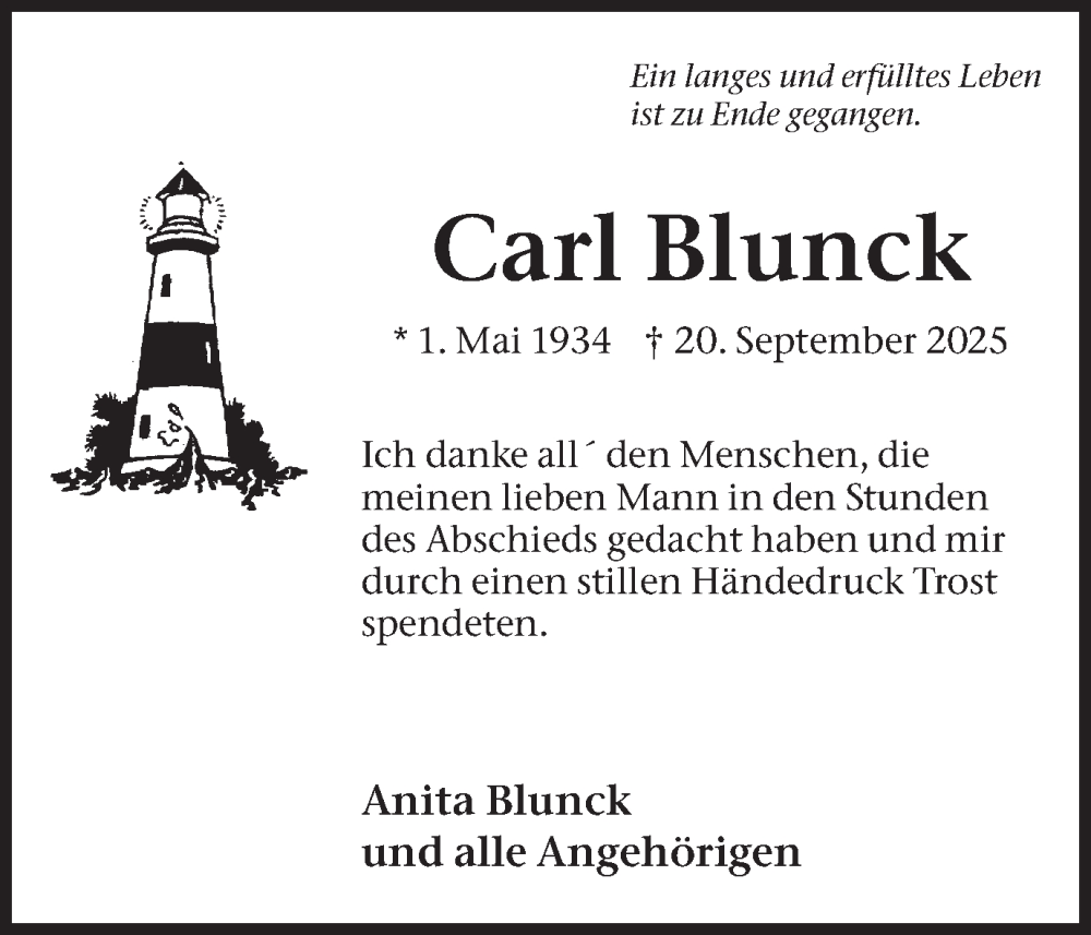 Hier finden Sie alle Traueranzeigen aus der Zeitung, die bisher für Carl Blunck erschienen sind. Weitere Traueranzeigen, die in der Zeitung erscheinen, werden hier ebenfalls aufgelistet