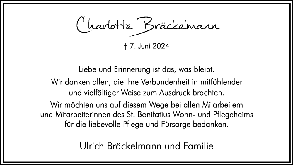 Hier finden Sie alle Traueranzeigen aus der Zeitung, die bisher für Charlotte Bräckelmann erschienen sind. Weitere Traueranzeigen, die in der Zeitung erscheinen, werden hier ebenfalls aufgelistet