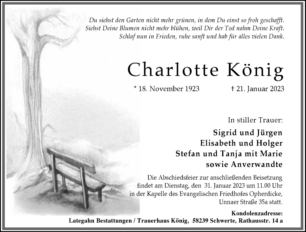 Hier finden Sie alle Traueranzeigen aus der Zeitung, die bisher für Charlotte König erschienen sind. Weitere Traueranzeigen, die in der Zeitung erscheinen, werden hier ebenfalls aufgelistet