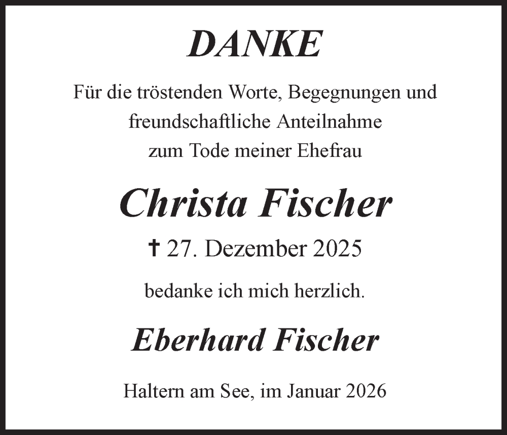 Hier finden Sie alle Traueranzeigen aus der Zeitung, die bisher für Christa Fischer erschienen sind. Weitere Traueranzeigen, die in der Zeitung erscheinen, werden hier ebenfalls aufgelistet