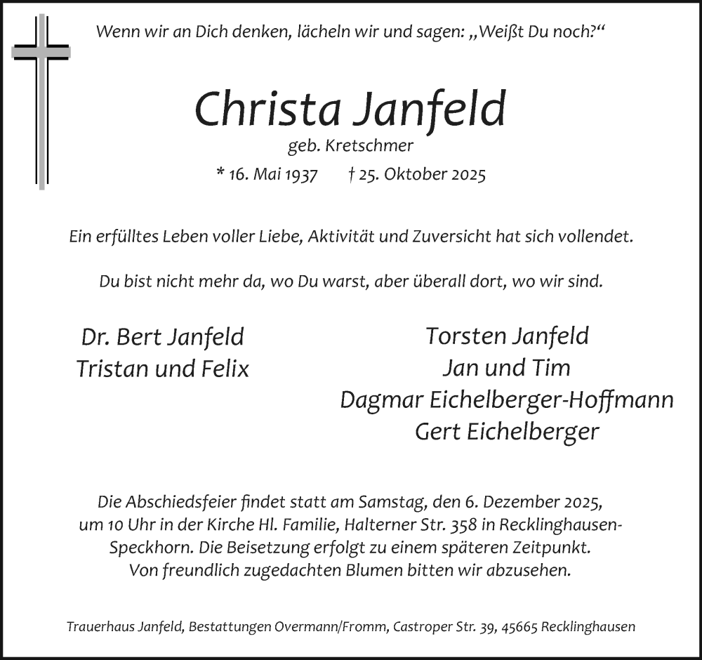 Hier finden Sie alle Traueranzeigen aus der Zeitung, die bisher für Christa Janfeld erschienen sind. Weitere Traueranzeigen, die in der Zeitung erscheinen, werden hier ebenfalls aufgelistet