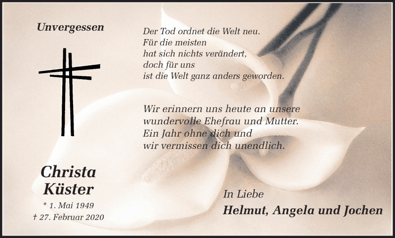 Hier finden Sie alle Traueranzeigen aus der Zeitung, die bisher für Christa Küster erschienen sind. Weitere Traueranzeigen, die in der Zeitung erscheinen, werden hier ebenfalls aufgelistet