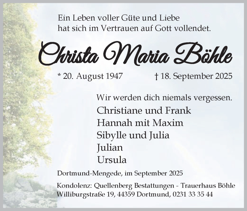 Hier finden Sie alle Traueranzeigen aus der Zeitung, die bisher für Christa Maria Böhle erschienen sind. Weitere Traueranzeigen, die in der Zeitung erscheinen, werden hier ebenfalls aufgelistet