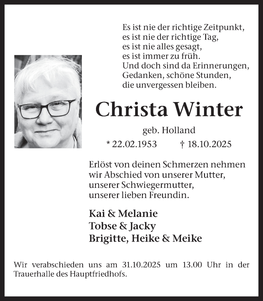 Hier finden Sie alle Traueranzeigen aus der Zeitung, die bisher für Christa Winter erschienen sind. Weitere Traueranzeigen, die in der Zeitung erscheinen, werden hier ebenfalls aufgelistet