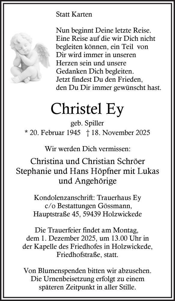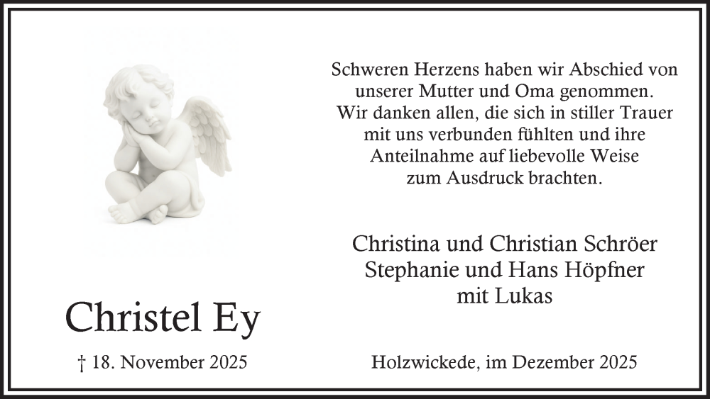 Hier finden Sie alle Traueranzeigen aus der Zeitung, die bisher für Christel Ey erschienen sind. Weitere Traueranzeigen, die in der Zeitung erscheinen, werden hier ebenfalls aufgelistet