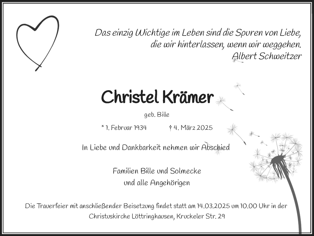Hier finden Sie alle Traueranzeigen aus der Zeitung, die bisher für Christel Krämer erschienen sind. Weitere Traueranzeigen, die in der Zeitung erscheinen, werden hier ebenfalls aufgelistet