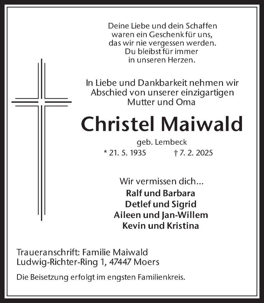 Hier finden Sie alle Traueranzeigen aus der Zeitung, die bisher für Christel Maiwald erschienen sind. Weitere Traueranzeigen, die in der Zeitung erscheinen, werden hier ebenfalls aufgelistet