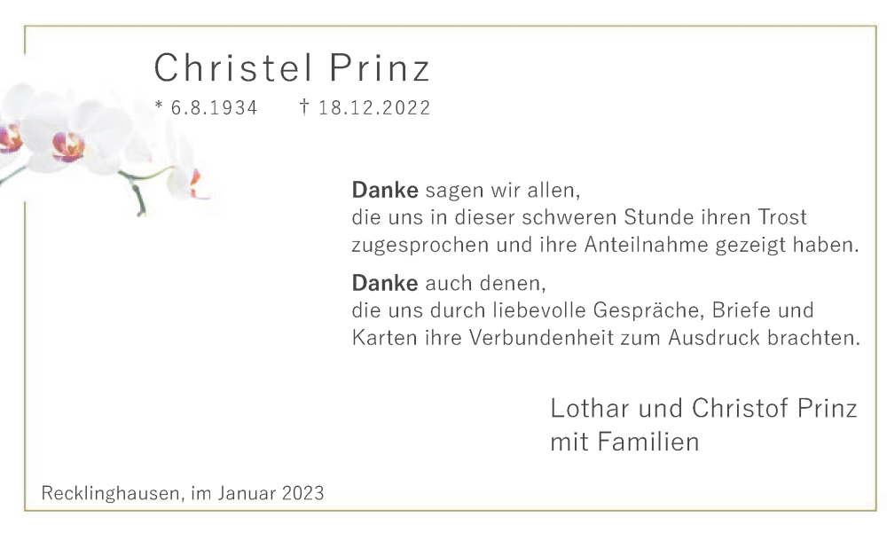 Hier finden Sie alle Traueranzeigen aus der Zeitung, die bisher für Christel Prinz erschienen sind. Weitere Traueranzeigen, die in der Zeitung erscheinen, werden hier ebenfalls aufgelistet