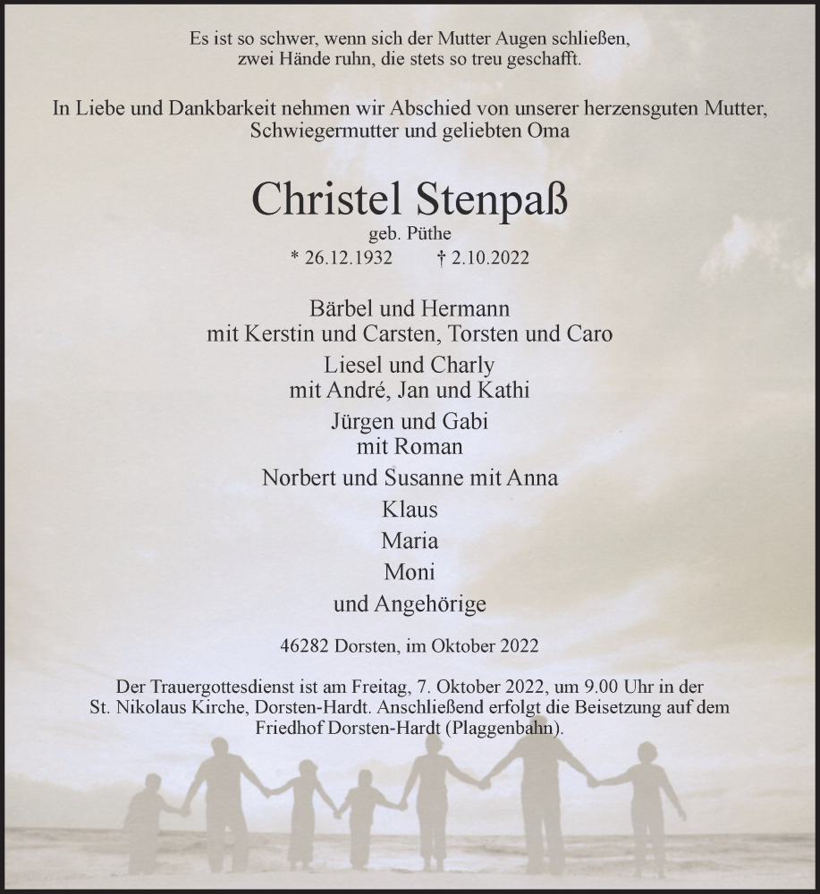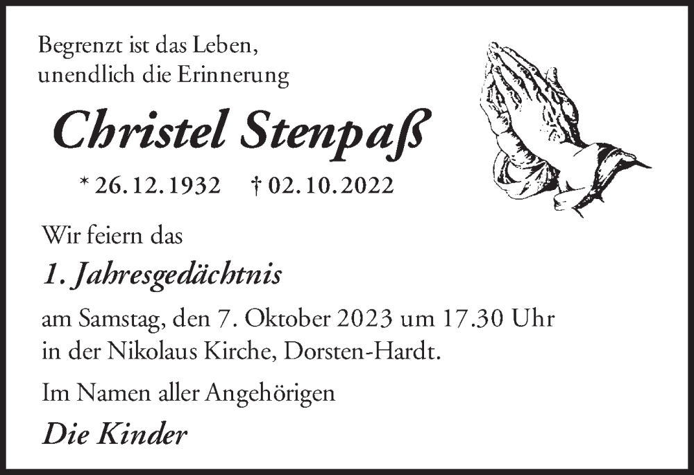 Hier finden Sie alle Traueranzeigen aus der Zeitung, die bisher für Christel Stenpaß erschienen sind. Weitere Traueranzeigen, die in der Zeitung erscheinen, werden hier ebenfalls aufgelistet