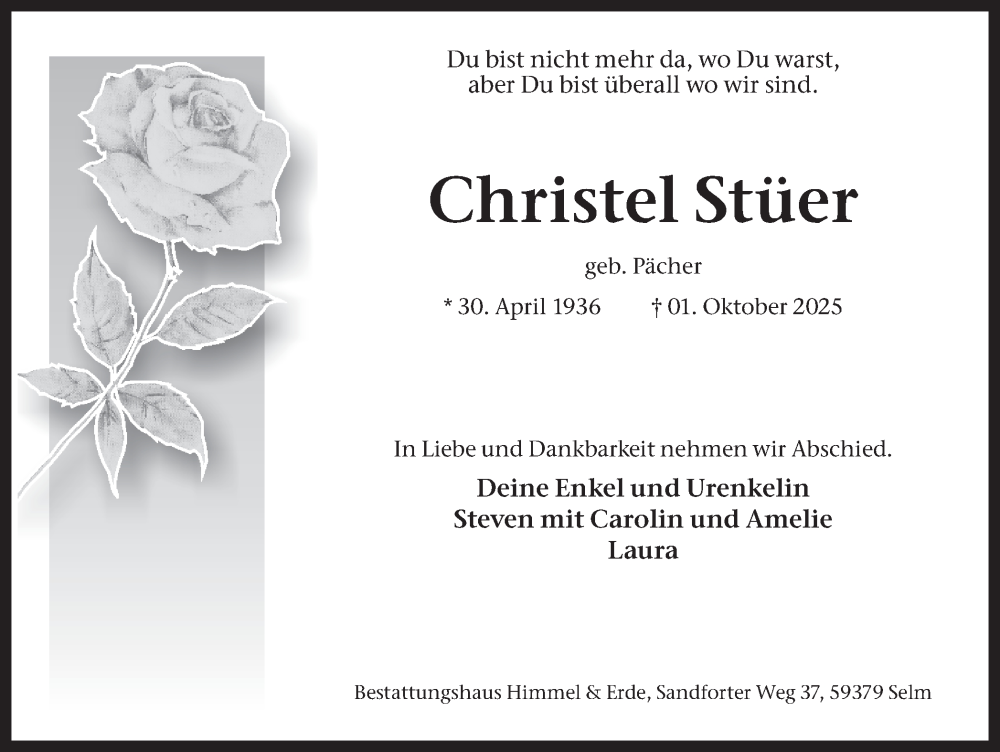 Hier finden Sie alle Traueranzeigen aus der Zeitung, die bisher für Christel Stüer erschienen sind. Weitere Traueranzeigen, die in der Zeitung erscheinen, werden hier ebenfalls aufgelistet