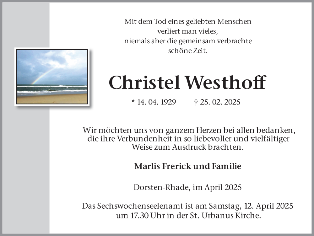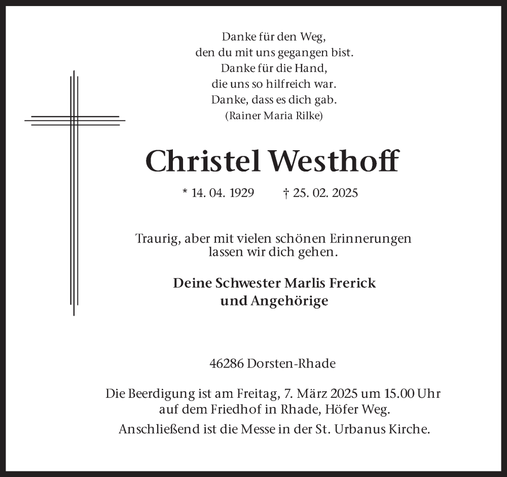 Hier finden Sie alle Traueranzeigen aus der Zeitung, die bisher für Christel Westhoff erschienen sind. Weitere Traueranzeigen, die in der Zeitung erscheinen, werden hier ebenfalls aufgelistet