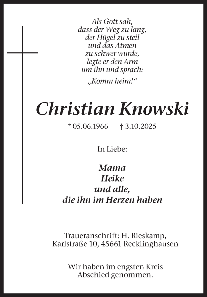 Hier finden Sie alle Traueranzeigen aus der Zeitung, die bisher für Christian Knowski erschienen sind. Weitere Traueranzeigen, die in der Zeitung erscheinen, werden hier ebenfalls aufgelistet