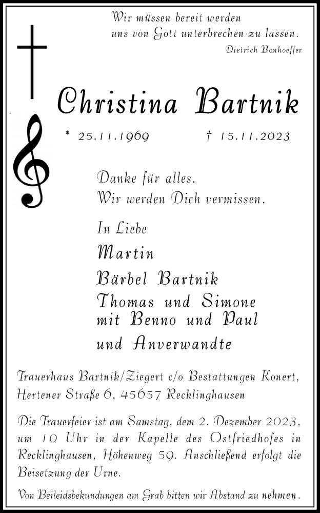 Hier finden Sie alle Traueranzeigen aus der Zeitung, die bisher für Christina Bartnik erschienen sind. Weitere Traueranzeigen, die in der Zeitung erscheinen, werden hier ebenfalls aufgelistet