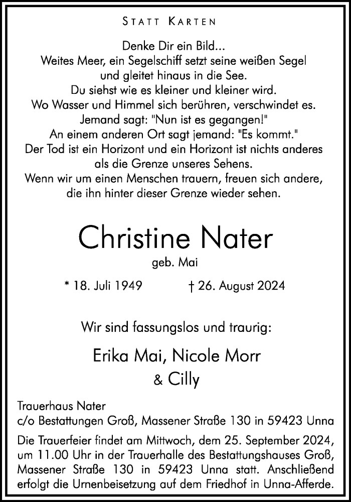 Hier finden Sie alle Traueranzeigen aus der Zeitung, die bisher für Christine Nater erschienen sind. Weitere Traueranzeigen, die in der Zeitung erscheinen, werden hier ebenfalls aufgelistet