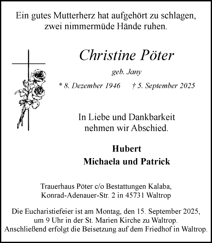 Hier finden Sie alle Traueranzeigen aus der Zeitung, die bisher für Christine Pöter erschienen sind. Weitere Traueranzeigen, die in der Zeitung erscheinen, werden hier ebenfalls aufgelistet