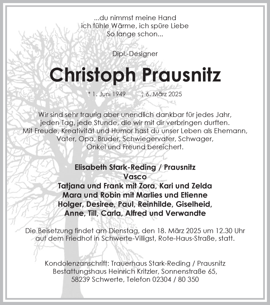 Hier finden Sie alle Traueranzeigen aus der Zeitung, die bisher für Christoph Prausnitz erschienen sind. Weitere Traueranzeigen, die in der Zeitung erscheinen, werden hier ebenfalls aufgelistet