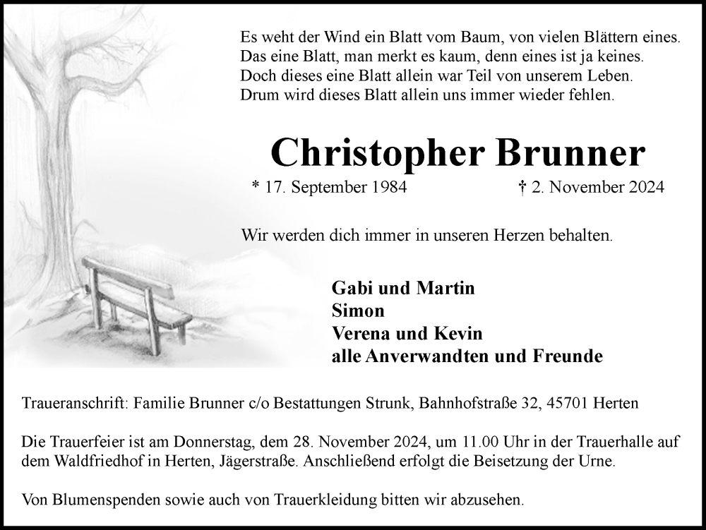 Hier finden Sie alle Traueranzeigen aus der Zeitung, die bisher für Christopher Brunner erschienen sind. Weitere Traueranzeigen, die in der Zeitung erscheinen, werden hier ebenfalls aufgelistet