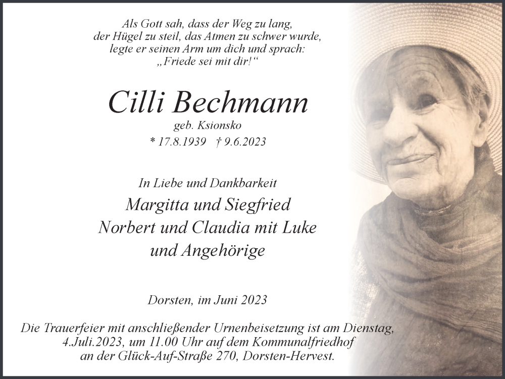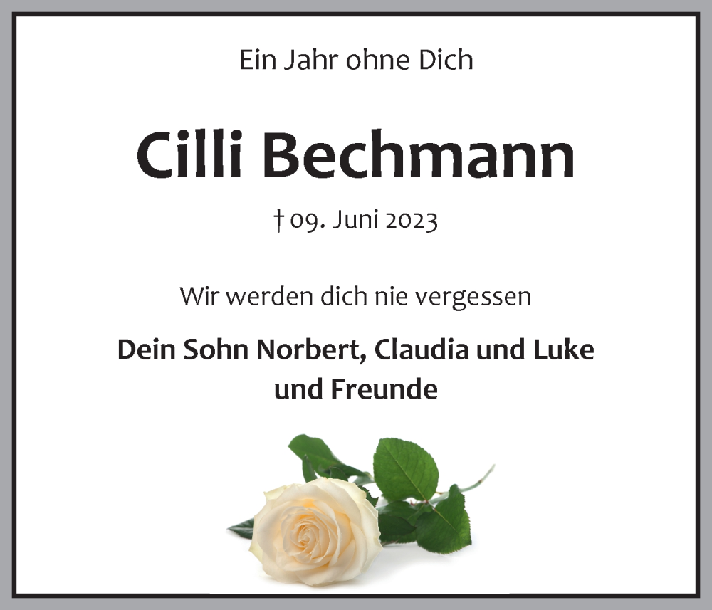 Hier finden Sie alle Traueranzeigen aus der Zeitung, die bisher für Cilli Bechmann erschienen sind. Weitere Traueranzeigen, die in der Zeitung erscheinen, werden hier ebenfalls aufgelistet