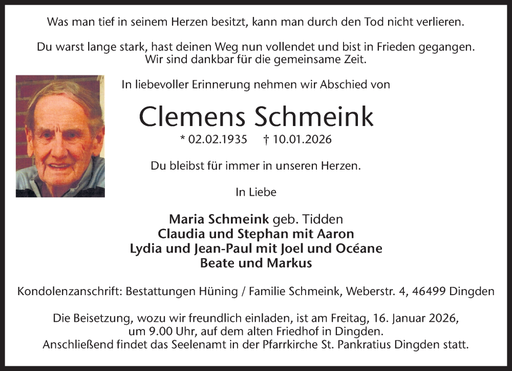 Hier finden Sie alle Traueranzeigen aus der Zeitung, die bisher für Clemens Schmeink erschienen sind. Weitere Traueranzeigen, die in der Zeitung erscheinen, werden hier ebenfalls aufgelistet