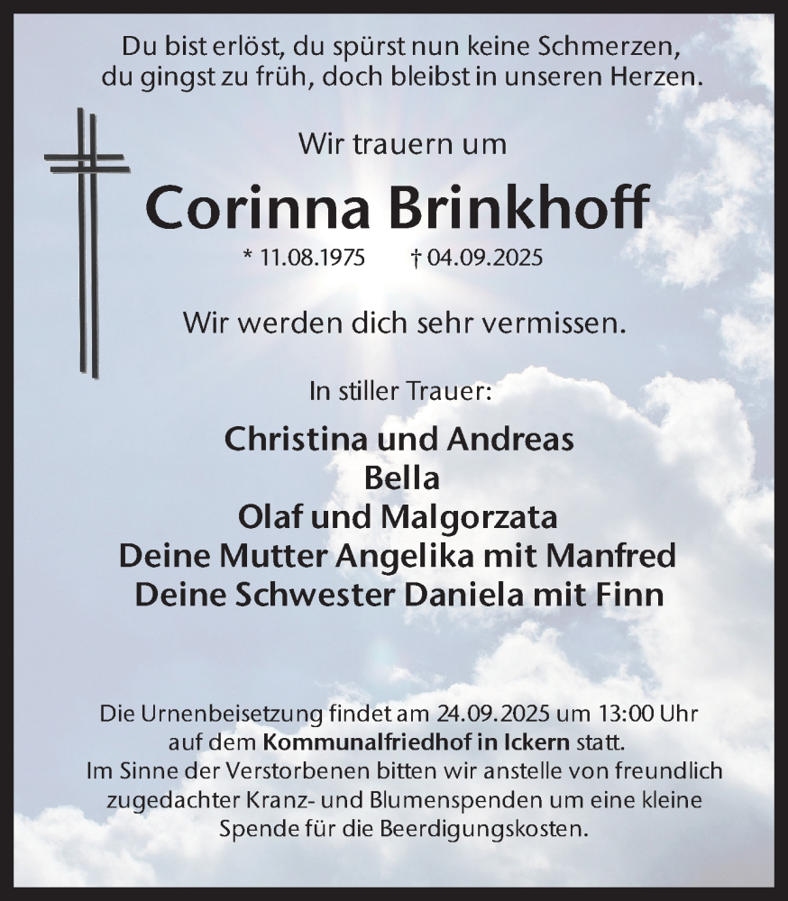 Hier finden Sie alle Traueranzeigen aus der Zeitung, die bisher für Corinna Brinkhoff erschienen sind. Weitere Traueranzeigen, die in der Zeitung erscheinen, werden hier ebenfalls aufgelistet