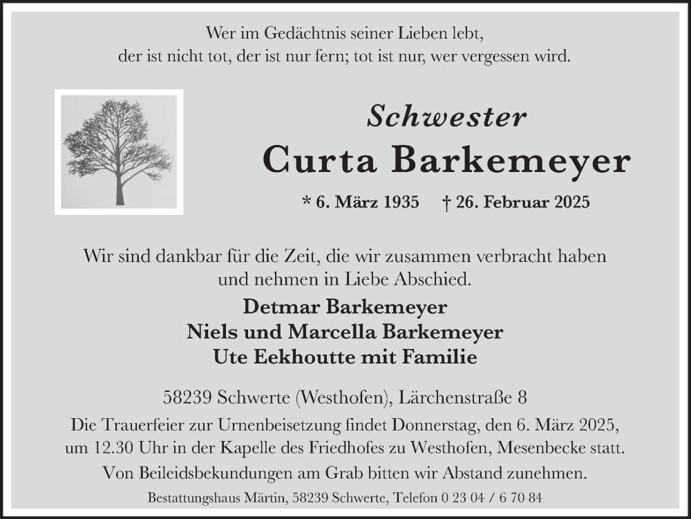 Hier finden Sie alle Traueranzeigen aus der Zeitung, die bisher für Curta Barkemeyer erschienen sind. Weitere Traueranzeigen, die in der Zeitung erscheinen, werden hier ebenfalls aufgelistet