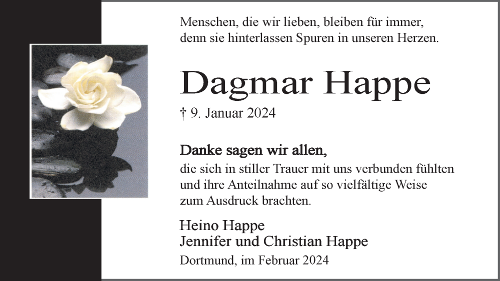 Hier finden Sie alle Traueranzeigen aus der Zeitung, die bisher für Dagmar Happe erschienen sind. Weitere Traueranzeigen, die in der Zeitung erscheinen, werden hier ebenfalls aufgelistet