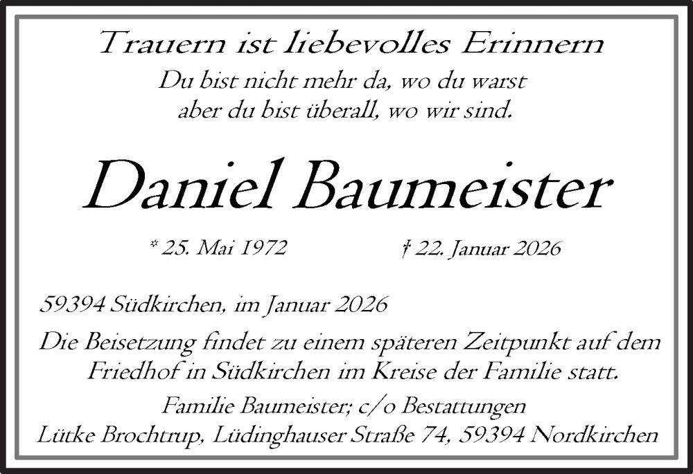 Hier finden Sie alle Traueranzeigen aus der Zeitung, die bisher für Daniel Baumeister erschienen sind. Weitere Traueranzeigen, die in der Zeitung erscheinen, werden hier ebenfalls aufgelistet